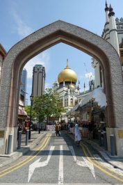Ebenso schön bunt wie kulturell ist auch das arabische Viertel. Viele muslimische Läden haben sich hier angesiedelt. Besonders bekannt sind die Händler für ihre Seidenware. Aber auch traditionelle Körbe, Medizin und Gewürze können hier erstanden werden. Auf der Muscat Straße, ca. in der Mitte der Arab Street, wird euch die Masjid Sultan Moschee sofort ins Auge fallen. Ein Tempel wie aus Eintausend und einer Nacht. Die große goldene Kuppel übertürmt die kleinen Häuser und wirkt wie aus einer anderen Welt. Seit 1975 gilt sie als Monument der Moslems in Singapur.