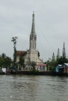 Unsere Tour begann gegen 7.30 Uhr mit einem Minivan und Guide, der uns vom Hotel abholte. Nach 2,5 Stunden erreichten wir unser erstes Ziel Cai Be. Cai Be ist ein kleines Dorf, das für seine traditionellen Obst- und Gemüsegärten bekannt ist und einen beliebten Ausflugsort für Touristen darstellt. Wir erkundeten das Dorf nicht zu Land, sondern setzten unsere Fahrt auf dem Wasser fort. Mit einem kleinen Holzschiff ging die Fahrt auf dem Mekong weiter und wir konnten das normale Leben der Bevölkerung verfolgen. Boote und Gondeln sind hier die alltäglichen Hauptverkehrsmittel und die Wasserwege für die Einheimischen ganz normale Straßen. Die Häuser entlang des Flusses wirken durch das feuchtwarme Klima etwas heruntergekommen, denn der Putz fiel ab und die Farben waren verblasst. Eine kleine Französische Kathedrale sticht heraus und wirkt vor dem Wasser sehr erhaben. Ein Großteil der hiesigen Bevölkerung lebt auf den großen Booten, die täglich ihre Waren auf dem kleinen schwimmenden Markt in Cai Be anbieten. Dieser verkleinert sich leider jedes Jahr, da die großen Märkte wie der bekannte Cai Rang Markt mehr Handelsoptionen bieten. Auch bei unserer Ankunft auf dem Cai Be Floating Market waren leider nicht mehr so viele Boote vorhanden, das lag aber auch an dem hiesigen Feiertag.