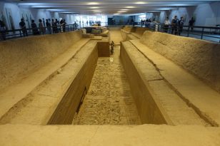 Das dritte Pit wurde im Juni 1976 etwa 120m östlich von Pit 2 entdeckt. Nur 68 Figuren, ein Wagen und 34 Bronze-Waffen wurden hier freigelegt. Es wird vermutet, dass dieses Pit das Kommandozentrum von Pit 1 und Pit 2 war. Wir konnten lediglich 4 Pferde und ein paar Krieger sehen, bei denen bei den meisten der Kopf fehlte. Ein Besuch dieses Pits lohnt nur, wenn du ein Foto mit den Imitaten der Terrakotta-Krieger machen möchtest (siehe Foto rechts), denn hier ist weniger los als in Pit 2.