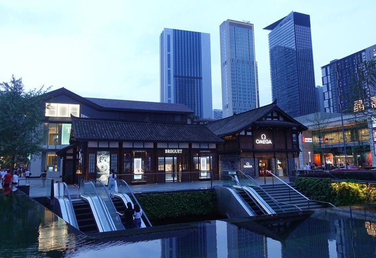 Anders als in den meisten chinesischen Städten, wurde die Einkaufsmeile mit den Shoppingsmalls fantasievoll durch Tempelanlagen aufgehübscht. Besonders in der Nähe der U-Bahn Haltestelle Chunxi Road verleitet die den Besucher zum längeren Aufenthalt und Shoppen. Alle großen Sport- und Modeketten haben sich hier angesammelt sowie ein paar neue Läden, die wir aus Deutschland noch nicht kannten.