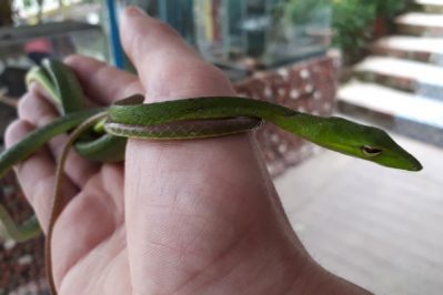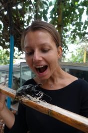 Am Anfang konnten wir uns unter einer Schmetterlingsfarm nichts vorstellen. Eher dachten wir an Käfige und Einweckgläser voller armer, toter Tiere. Doch dem war ganz und gar nicht so. In der Tour war der Eintrittspreis nicht enthalten und so mussten wir 7 MYR nachzahlen. Für das was uns erwartete, war es aber nicht zu teuer. Durch eine Tür gelangten wir in eine Art großes Gewächshaus und sofort wurden wir von vielen Schmetterlingen umzingelt. Überall waren farbenprächtige Blumen zu sehen und große Schmetterlinge in den schönsten Farben. Eine Frau gab uns sogar die Schmetterlinge auf die Hand, die so unglaublich zahm waren und wunderschön. Man konnte sich nicht sattsehen an der Vielzahl und den bunten Flügeln um einen herum. Unser Guide zeigte uns aber noch andere Tiere. Grüne Schlangen und riesige hirschkäferähnliche Kreaturen, die wir in die Hände nehmen konnten. An einem Baum hingen sogar mehrere schmale Äste herunter, die sich später als Stabheuschrecken herausstellten. André bekam seine riesige Schrecke fast nicht mehr vom Bauch.