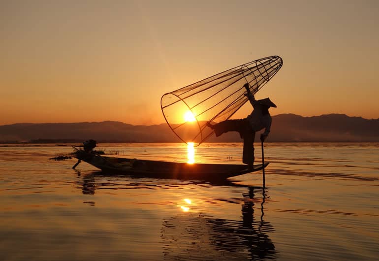 Hier auf dem Inle Lake erhält man das überall bekannte Fotomotiv der Einbeinruderer: Die Intha-Fischer stehen an einer Seite ihres Kanus, steuern mit einem Bein das Boot und Fischen mit einem Großen Netz. Ein wundervolles Fotomotiv. Zu Beginn der Tour fuhren wir zu denzu den für die Touristen posierenden Einbeinruderen. Diese zeigten den Touristen ihre Kunststücke auf den Booten – ein wahrer Balanceakt!