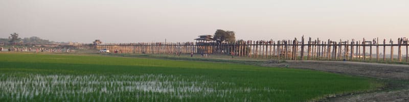 Um 8.30 Uhr morgens, wurden wir vom Hotel mit dem Taxi abgeholt. Die nur 11 km südlich von Mandalay entfernte ehemalige Königsstadt Amarapura ist besonders durch die U-Bein Brücke und das Mahagandaryon Kloster bekannt. Die 1,2 Kliometer lange U-Bein Brücke ist die Hauptattraktion in Amarapura. Aus über 1.000 Teakholzstämmen, die zum Teil aus den Trümmern des Inwa Königreiches stammen, verbindet die U-Bein Brücke die beiden Ufer des Taungthaman Sees. Die einst vergoldeten Teakholzstämme wirken heute nicht mehr so massiv, wie zur Zeit ihrer Erbauung 1851 von König Pagan. Die U-Bein Brücke schaut man sich am besten abends an, wenn der Sonnenuntergang die Teakholzbrücke in ein dunkles Rot taucht. Am Ende dieses Beitrages findet ihr noch die besten Sonnenuntergangsfotos von der U-Bein Brücke.