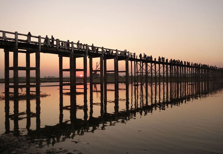 Nachdem wir die beiden Städte Sagaing und Inwa besucht hatten, ging es zuück nach Amarapura um den Sonnenuntergang an der U-Bein Brücke zu bestaunen. Wir erreichten kurz vor Sonnenuntergang die U-Bein Brücke. Es ein wunderschönes Ereignis, den Sonnenuntergang hier zu erleben. Man besitzt die Möglichkeit zu überteuerten Preisen, mit einem Kanu auf den See zu fahren, um den Sonnenuntergang mit der Brücke vom Wasser aus einzufangen. Wir haben das Ereignis am Ufer des Sees, vor der Brücke bewundert und sind dann entlang der Brücke gewandert und haben die untergehende Sonne bei einem kalten Bier genossen.