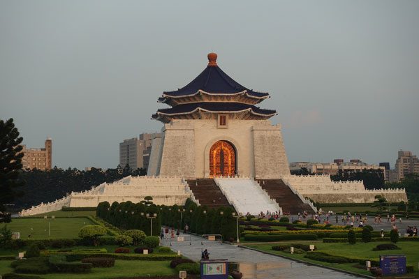 Überraschend standen wir auf einmal vor einer der schönsten Attraktionen von Taipei. Die 70 Meter hohe Gedächtnisstätte für den ehemaligen bis 1975 regierenden Präsidenten Chiang Kai-shek wurde 1980 eröffnet. Die beeindruckende, riesige Halle steht an der Ostseite des Taiwan-Demokratie-Parks. Ihr gegenüber im Westen, befindet das weiße, mit blauem Dach bestückte Haupttor der Anlage. Wenn die Sonne unter geht ist es dort am schönsten. Die letzten Sonnenstrahlen fallen durch die Bögen des Tores und erleuchten das riesige 17 Meter hohe Holztor der Memorial Hall. In dieser befinden sich mehrere Gegenstände und Schriften des ehemaligen Präsidenten Chiang Kai-shek.