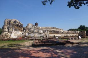 Der Wat Lokayasutha, auch der Tempel des ruhenden Buddhas genannt befindet westlich sich des alten Königspalastes. Er beherbergte ehemals den großen liegenden Buddha, der eines der bekanntesten Objekte in Ayutthaya ist. Mit 42 Metern Länge und 8 Metern Höhe ist es sogar schwer ihn mit der Kamera gänzlich einzufangen. Aus Ziegelsteinen und Mörtel bestehend, stützt sich der Buddha mit seiner rechten Hand ab und wird von vier Lotusblüten gehalten. Hinter der Statur kann man noch Überreste der Tempelanlage erkennen, in die der Buddha früher eingebettet war.