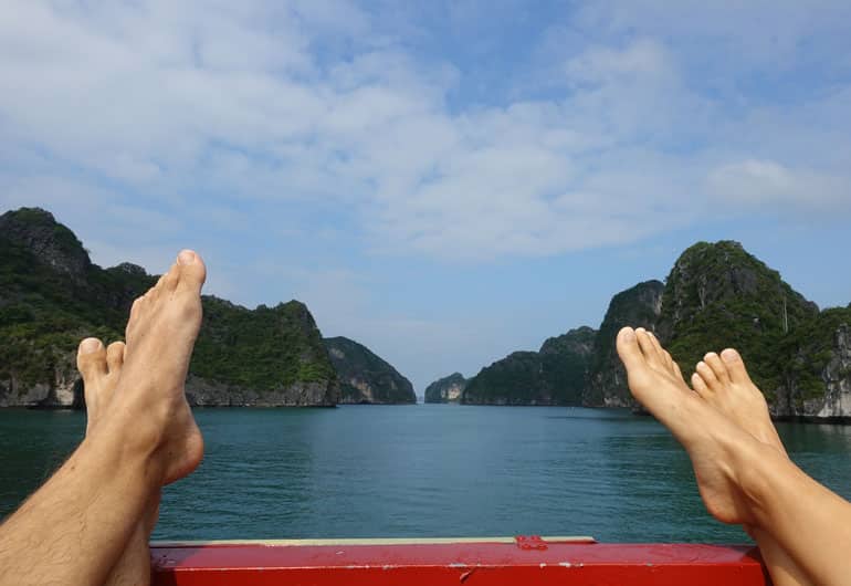 Wir entschieden uns, so wie viele andere Touristen, die Ha-Long-Bucht von der Insel Cat Ba zu erkunden. Man nennt die Küstenstadt Ha-Long-Stadt zwar „Das Tor zur Ha-Long Bucht“, aber wir haben gehört, das die Stadt keinen Charm besitzen soll und von blinkenden Karaokebars überflutet ist. Cat Ba hingegen ist die größte Insel der Ha-Long-Bucht und besteht wie die Bucht selbst, aus vielen zerklüfteten, grün bewaldeten Kalksteinfelsen. Über die Hälfte der Insel gehört zum Nationalpark und bietet euch viele Möglichkeiten zum Wandern, Klettern, Segeln und mehr.